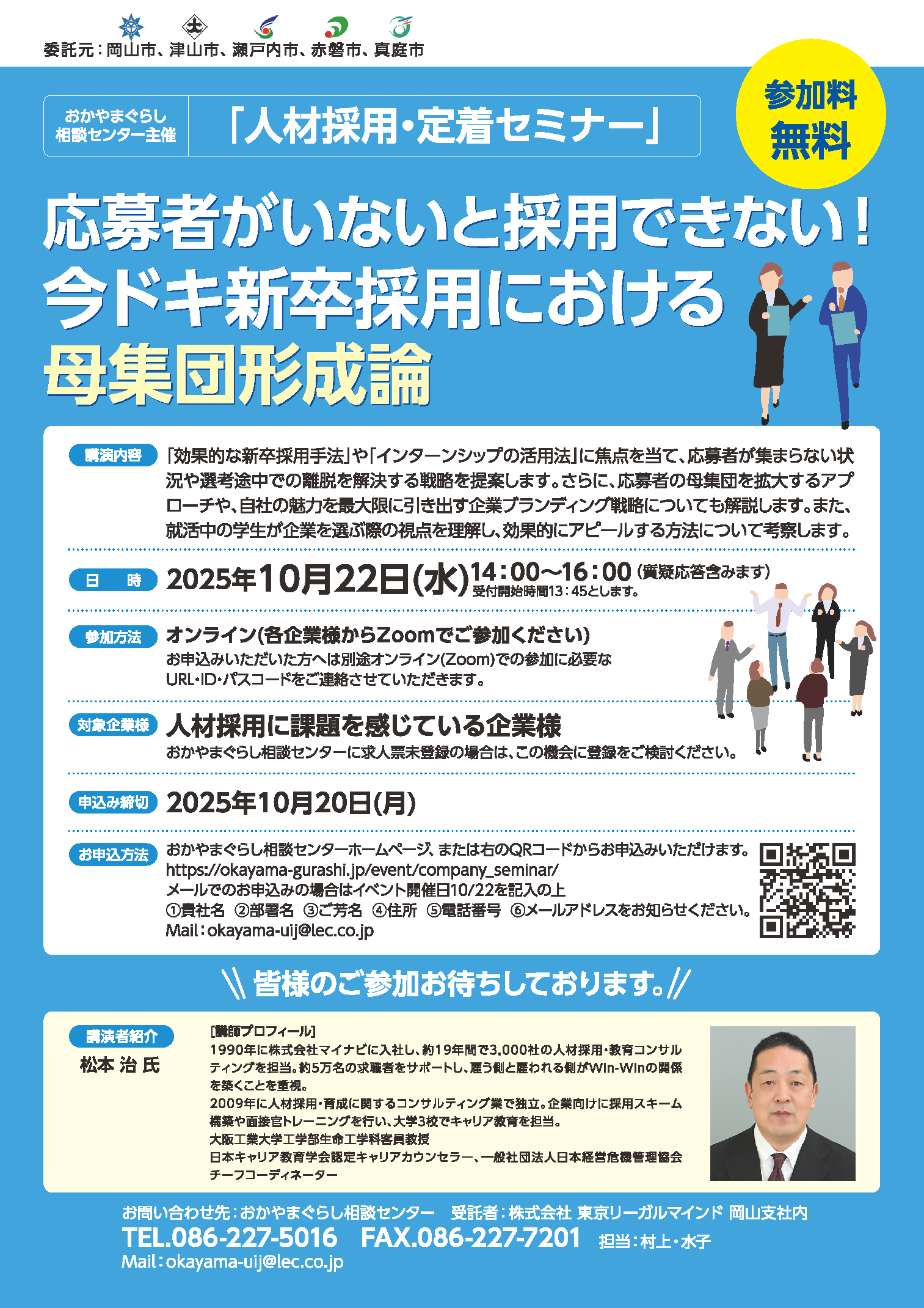 「お名前・年齢・連絡先電話番号・10/22(水)人材採用・定着セミナー」を明記ください。