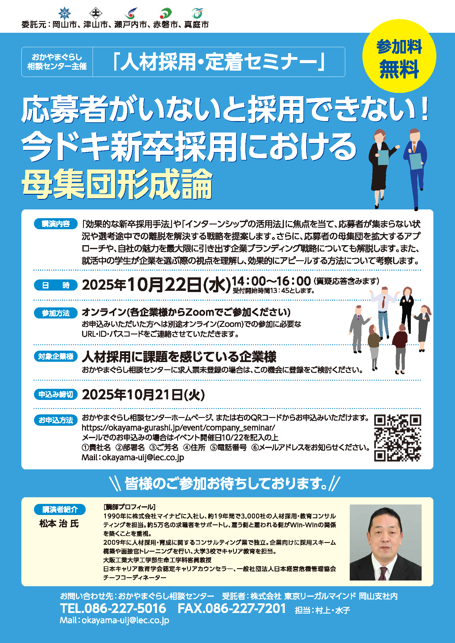「お名前・年齢・連絡先電話番号・10/22(水)人材採用・定着セミナー」を明記ください。