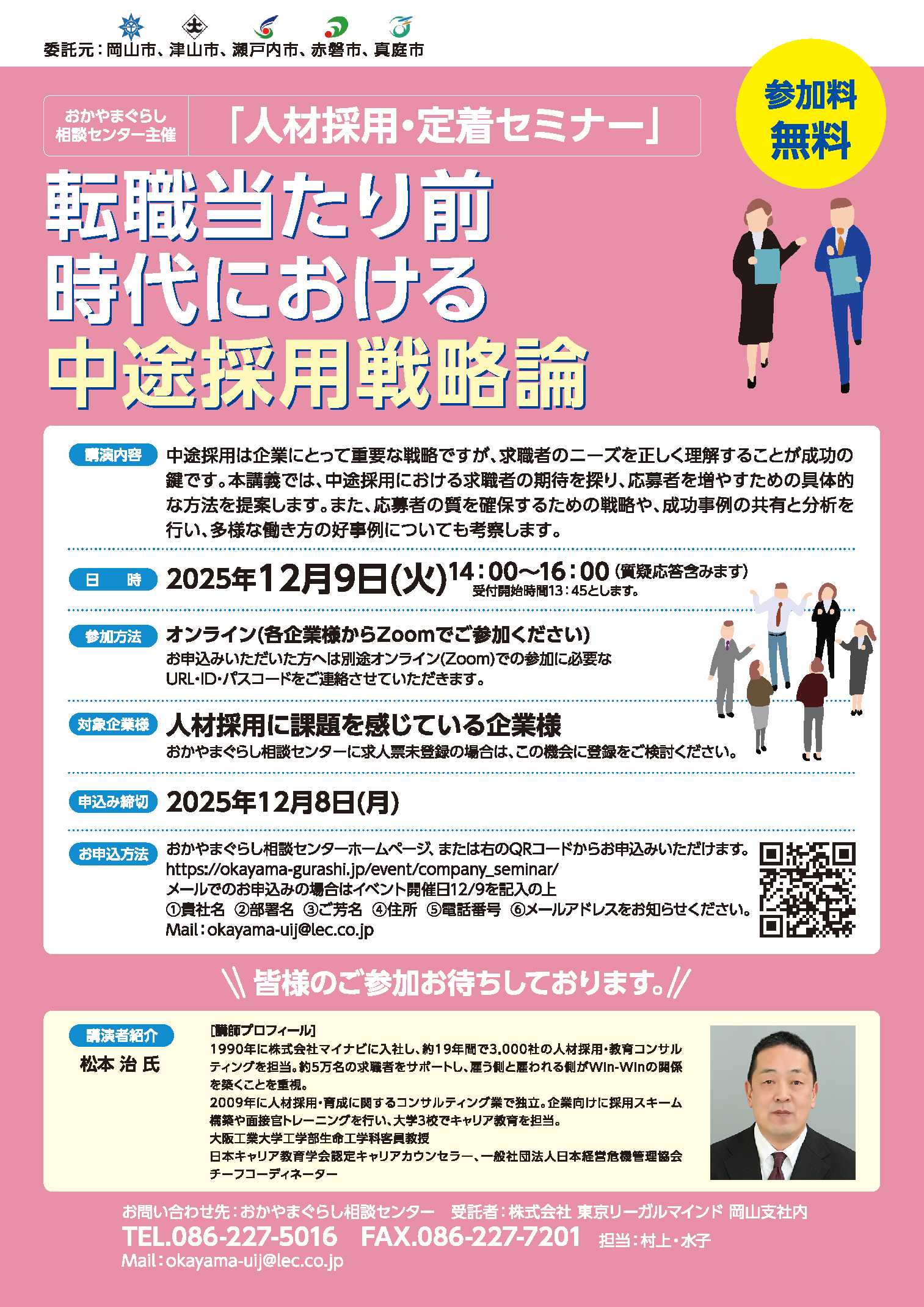 「お名前・年齢・連絡先電話番号・12/9(火) 人材採用・定着セミナー」を明記ください。